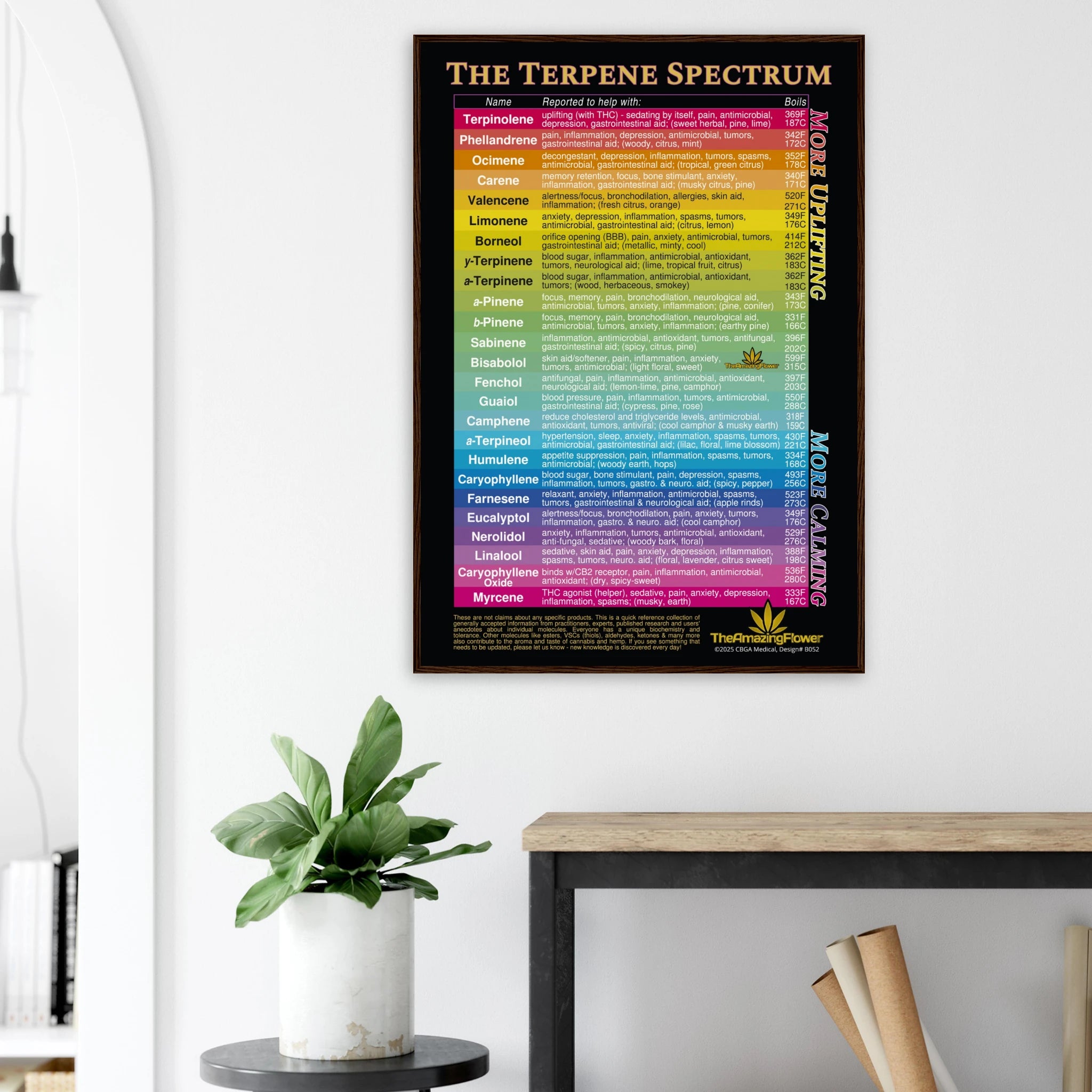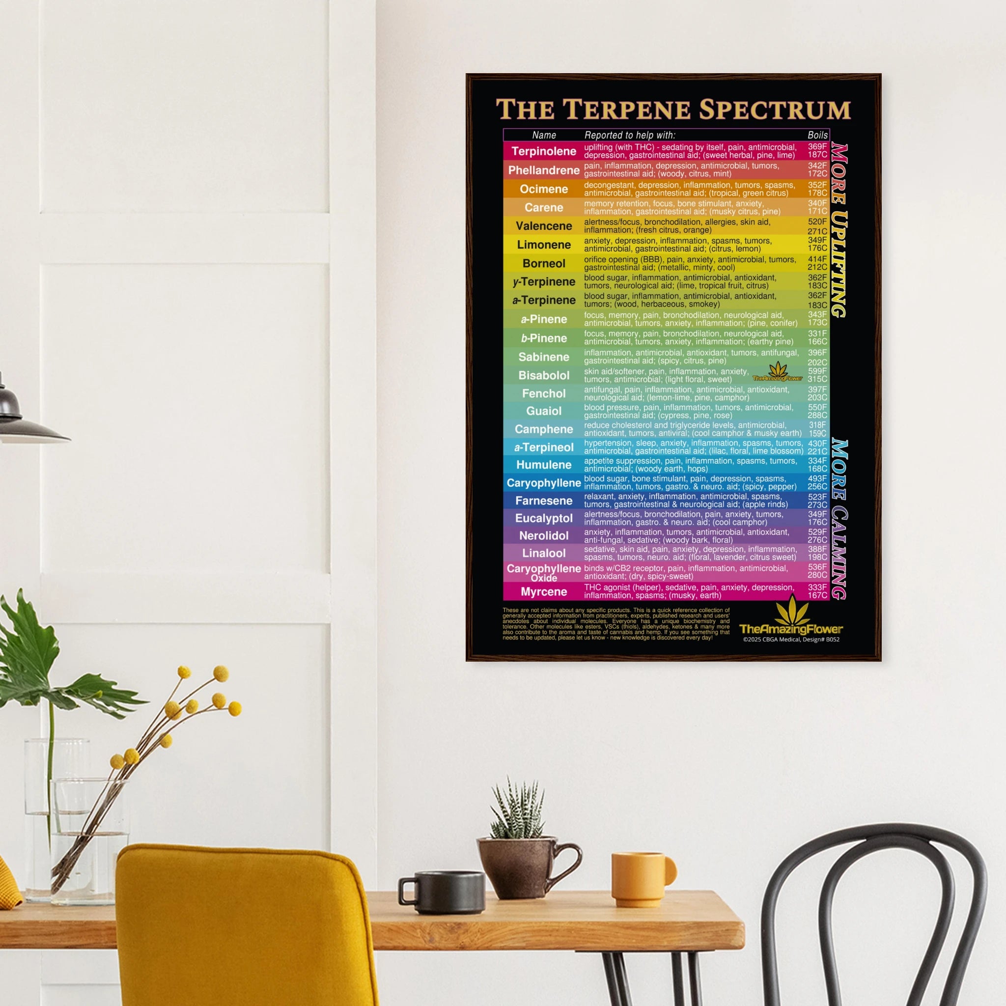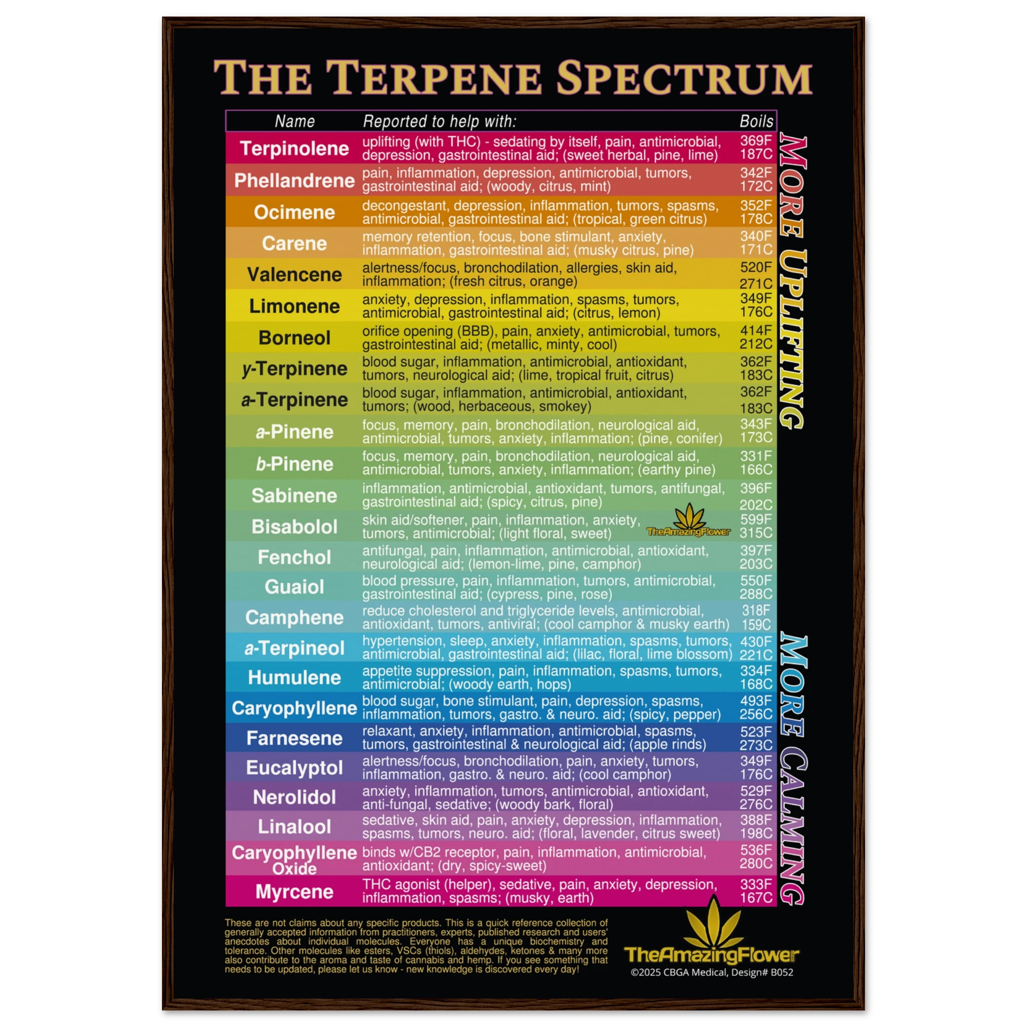 25 of the most common cannabis and hemp terpenes and their reported effects, aromas, and boiling points. Listed and color-coded by whether they are considered ‘more uplifting’ or ‘more calming’. Printed on thick and durable uncoated matte archival paper, it offers museum-quality color for many years.
