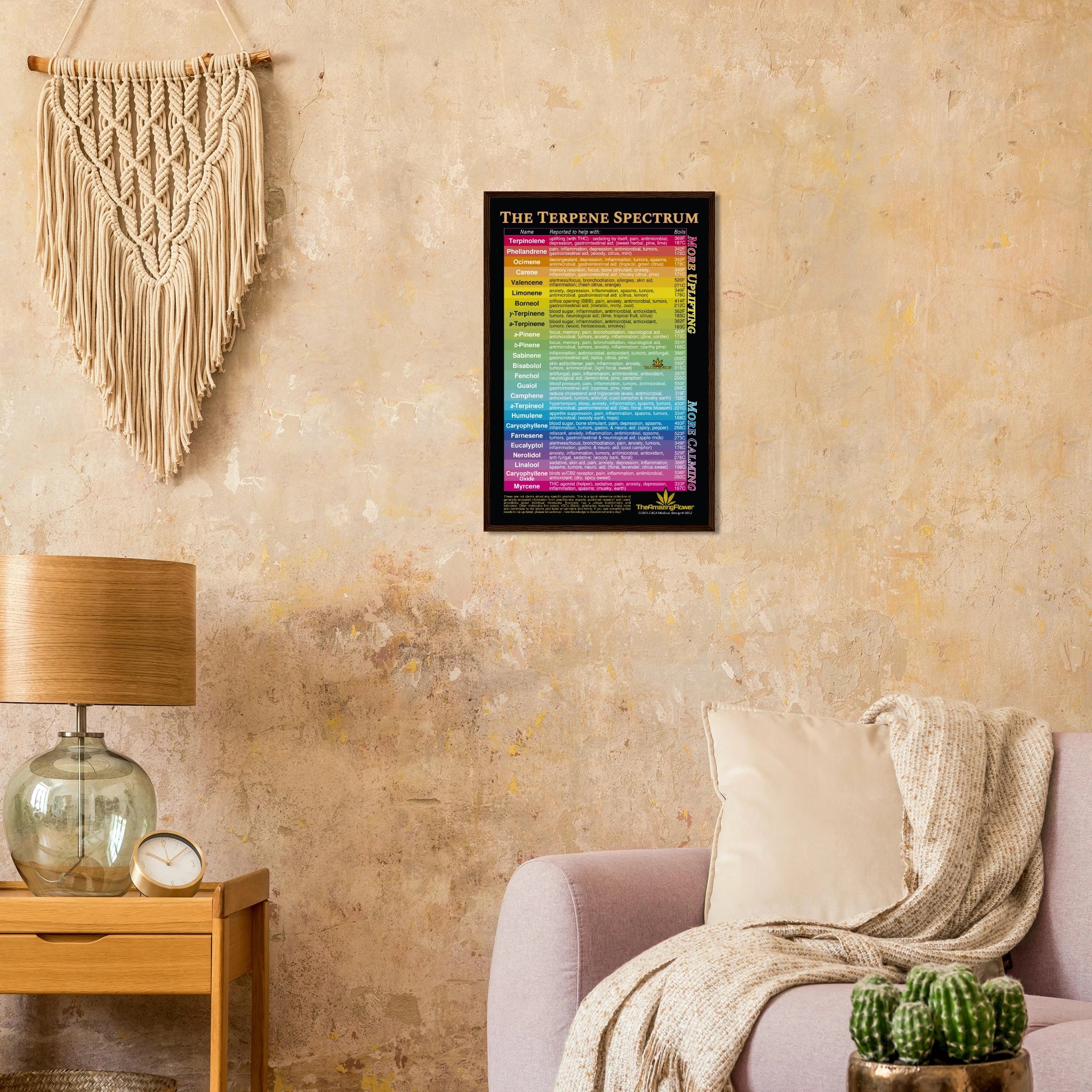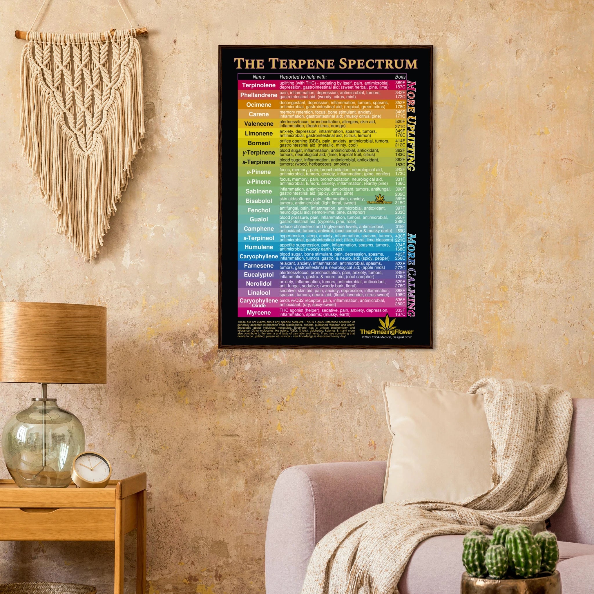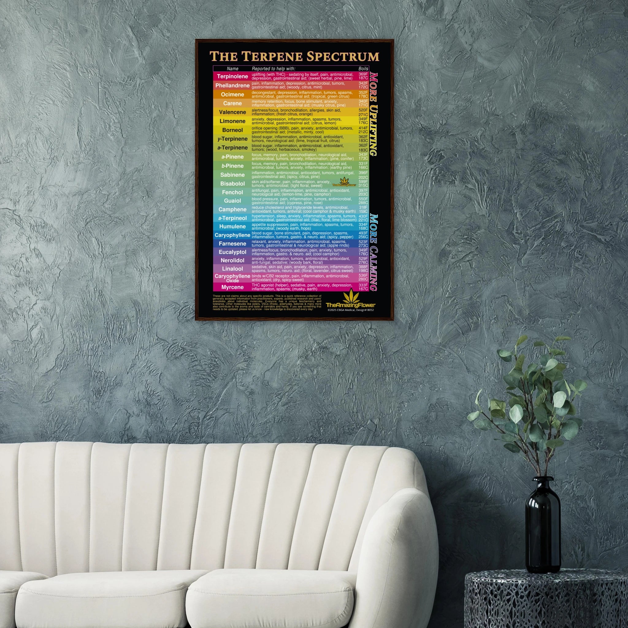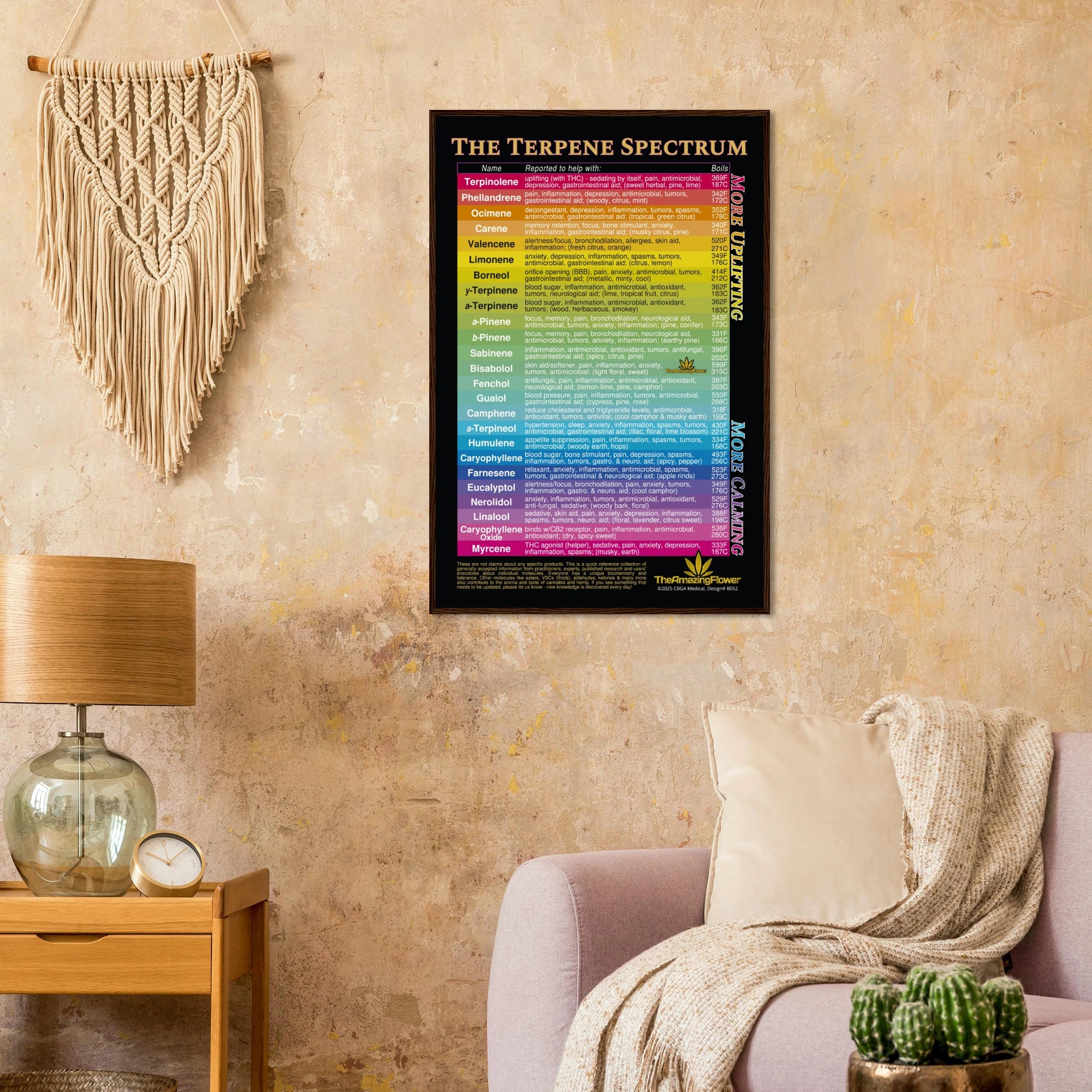 25 of the most common cannabis and hemp terpenes and their reported effects, aromas, and boiling points. Listed and color-coded by whether they are considered ‘more uplifting’ or ‘more calming’. Printed on thick and durable uncoated matte archival paper, it offers museum-quality color for many years.