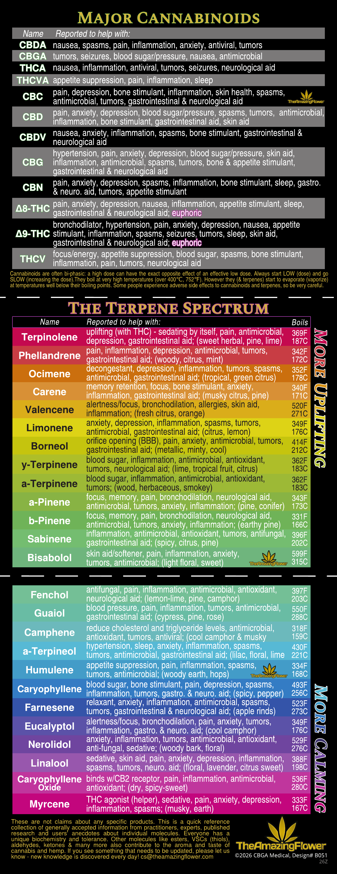 - 25 Cannabis Terpenes and their reported benefits, boiling points, and general aromas.