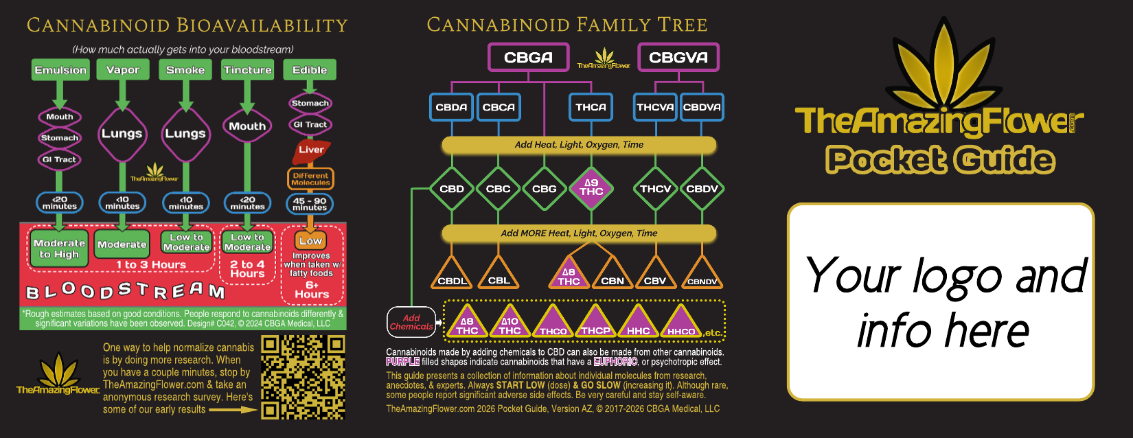 It's a small and durable 4.25-inch by 3.67-inch tri-fold pocket card that includes some great basic information about cannabis and hemp from an active ingredient perspective. It includes the following information: